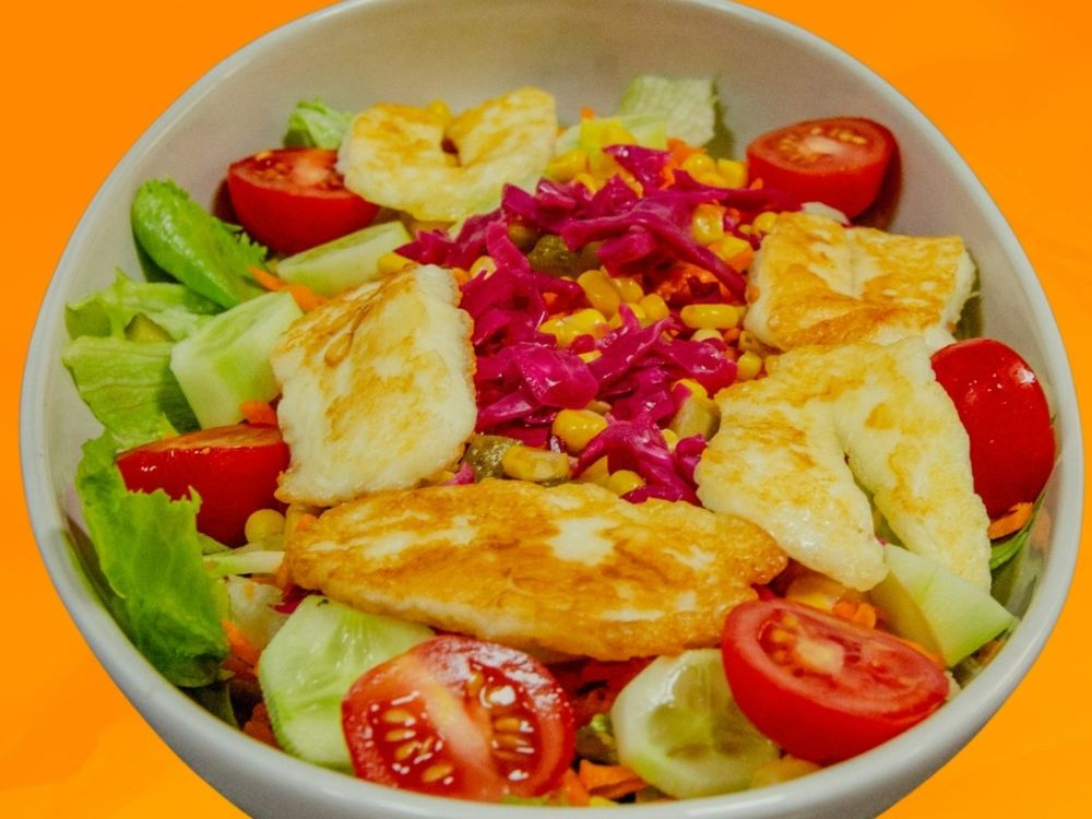 Cheddar soslu tavuk (200 g), makarna, mevsim salatası ve patates kızartması ile