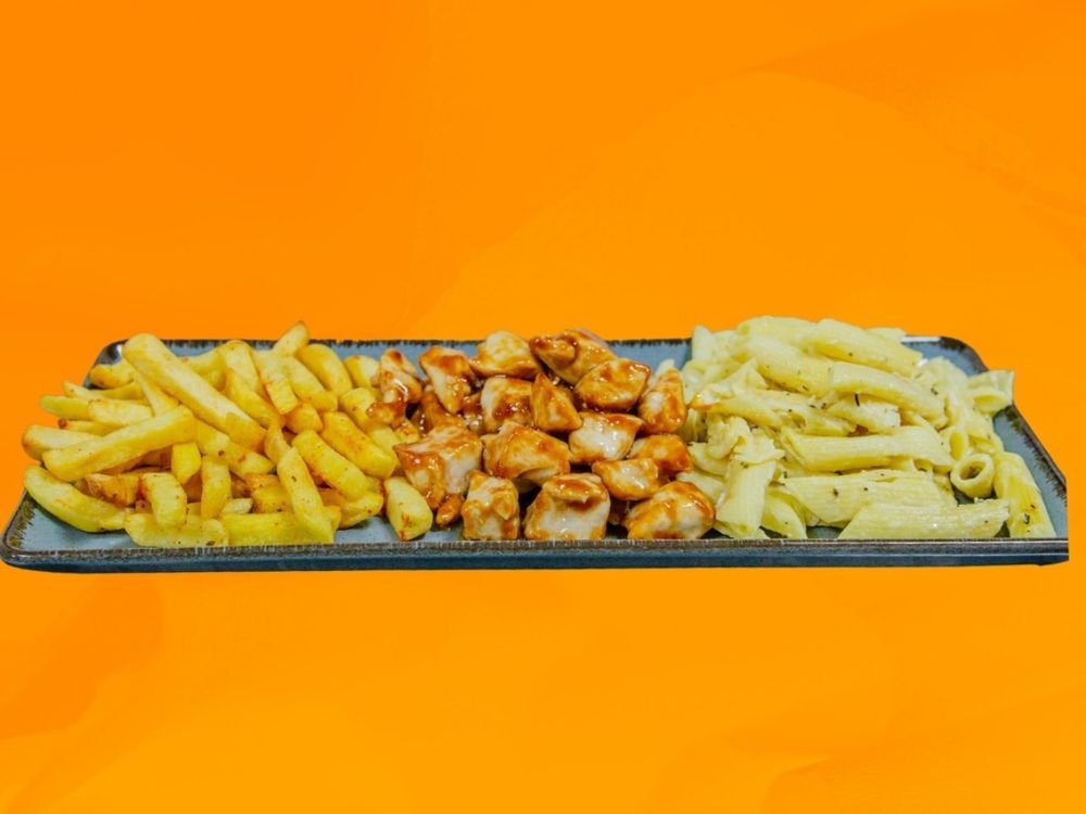 Peri peri soslu tavuk (200 g), makarna, mevsim salatası ve patates kızartması ile